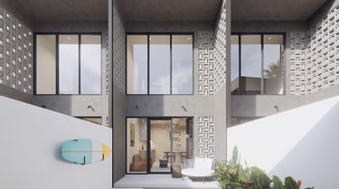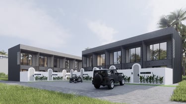 This development presents a striking contemporary interpretation of tropical living. The dark monochromatic façade creates a distinct visual rhythm against the skyline, softened by iconic white arches that balance a sleek aesthetic with the inviting soul of a private retreat.